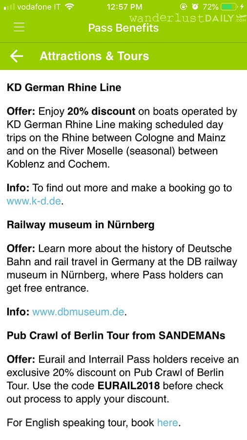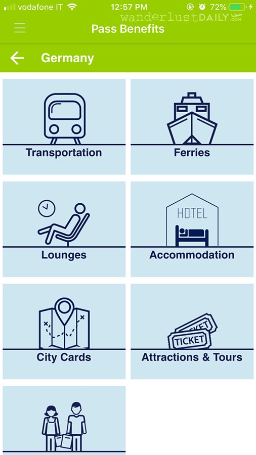 Aprendo l’app e selezionando Pass Benefits, selezionate il paese di vostro interesse e la categoria (attrazioni, hotel, traghetti ecc). Qui si scoprono infatti moltissimi sconti che sul sito non avevo notato prima della partenza. Questo è un esempio se si seleziona Germania: