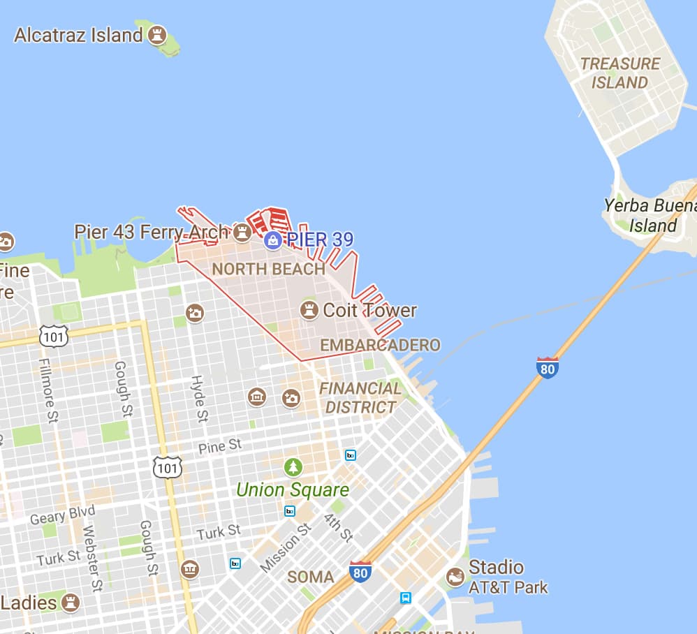 Come dice il nome e come vedete dalla mappa, quest’area si trova a nord e comprende il famoso Pier 39 con la miriade di negozi e ristoranti (e i leoni marini) e il Pier 33 dalla quale partono i tour per Alcatraz. È una zona molto vivace che si trova a pochi minuti da Little Italy e dal Financial District.