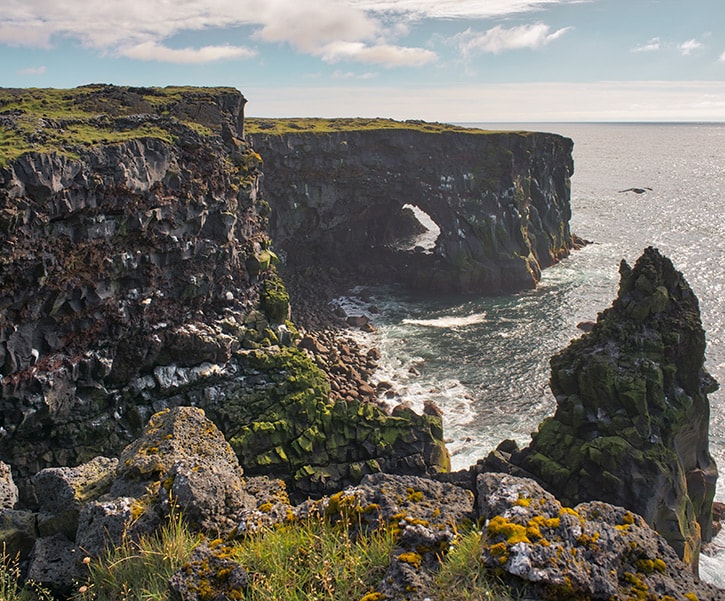 L’escursione sulla penisola di Snæefellsnes vi porterà al piccolo (microscopico!) paesino di pescatori di Arnarstapi per vedere la costa frastagliata costantemente colpita dalle onde dell’oceano Atlantico. Qui ci sono anche degli archi di basalto naturali, quelli di Hellnar. Passeggerete sulla piccola spiaggia di Djupalónssandur.