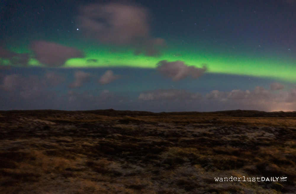 Il penultimo giorno faccio un tour della costa sud e mi si riempiono gli occhi di stupore e il cuore di meraviglia. Vedo spiagge con la sabbia nera, un ghiacciaio, panorami mozzafiato e cascate. Avvicinandomi alla cascata Seljalandsfoss e camminandoci dietro, mi si bagnano i capelli, la macchina fotografica e tutta la parte davanti dei jeans. Infreddolito ma elettrizzato, con il naso che cola, mi unisco al resto dell’autobus, diventato un concerto di nasi che tirano su. Tutti bagnati ma con le facce ancora sbalordite. Come la mia quando, dopo il tour, nella lobby dell’ostello verso le 20:30, aspetto l’autobus per un’ultima escursione. Si avvicina la ragazza del desk: “Domani porteranno la tua valigia”. Parole che aspettavo da giorni, proprio come aspettavo questo tour: quello dell’aurora boreale.