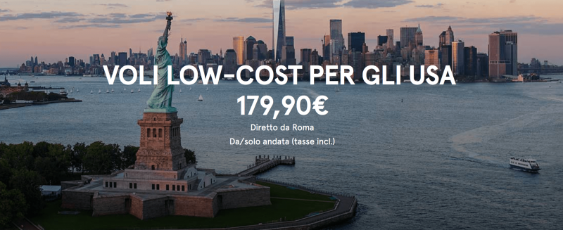 I voli low cost da Roma a New York inizieranno precisamente dal 9 Novembre 2017 per quattro volte a settimana fino a Febbraio 2018 quando aumenteranno poi a sei volte a settimana con l’arrivo dell’alta stagione. Prezzi a partire da 179€ a tratta, tasse incluse in Economy; 469€ a tratta, tasse incluse in Premium.